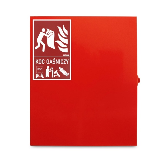 Metalowa szafka przeznaczona do przechowywania koca gaśniczego. Chroni przed kurzem, zabrudzeniami i czynnikami atmosferycznymi, a jednocześnie poprawia estetykę miejsca montażu (np. stacje paliw, banki, instytucje).