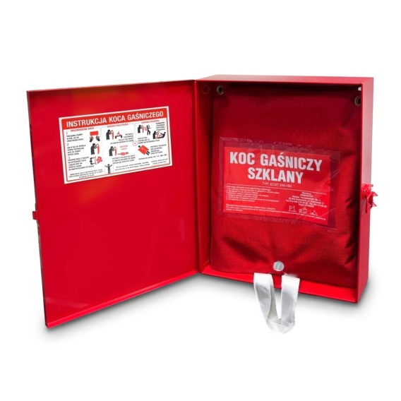 Zestaw, koc gaśniczy plus szafka na koc 1. Koc gaśniczy o wymiarze 140x180 cm. 2. Szafka ochronna na koc gaśniczy.