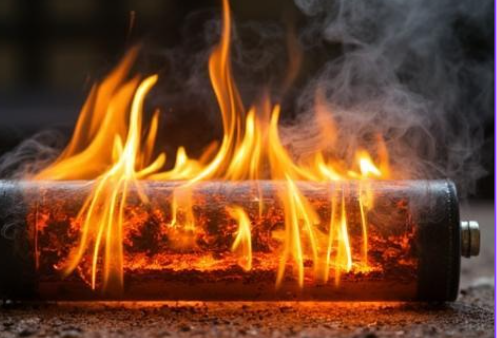 - Uwaga: Nawet jeśli płomienie zgasną, uszkodzone ogniwa mogą ponownie się zapalić, jeśli proces thermal runaway nie został całkowicie przerwany (np. przez chłodzenie wodą).